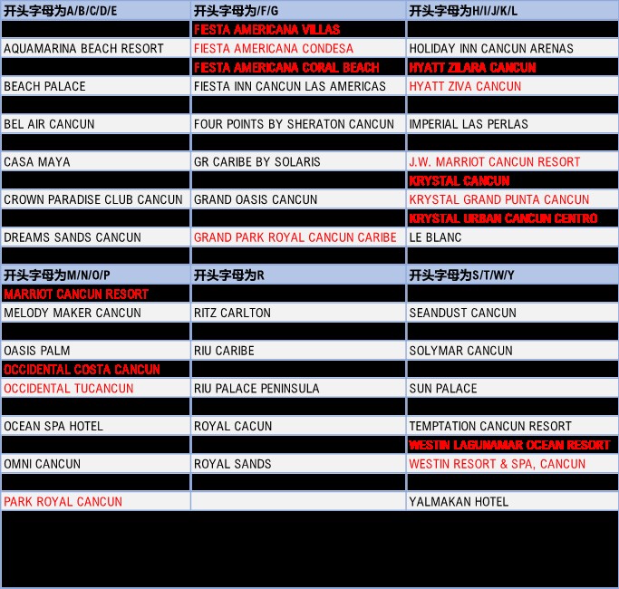坎昆酒店区(Zona Hotelera)内的大部分酒店可以提供免费接送,详情请参阅附录一《坎昆中文一日游免费接送酒店/上车点》